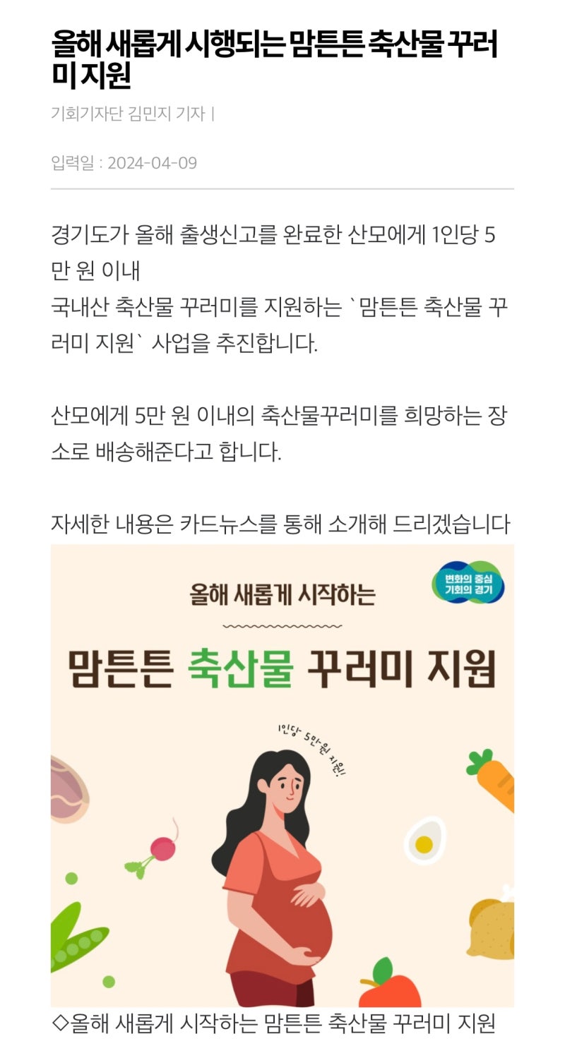 새 생명의 탄생을 축하드립니다 🙂 자세한 내용은 경기민원24 홈페이지에서 맘턴턴 축산물 패키지 지원을 확인해주세요! 맘턴튼 축산물 패키지 지원 바로가기