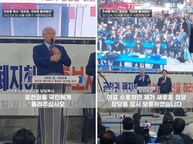 4월 17일 기자회견에서 국민의힘과 결별하고 창당할 것이란 전망이 나왔으나 전광훈 목사도 국민의힘과 최종 조율하는 모습을 보여 국민의힘 측이 힘을 얻었다. 전광훈 목사. 사실이기 때문에 현재 전광훈 목사님에게 끌려가는 것이 당연해 보입니다.