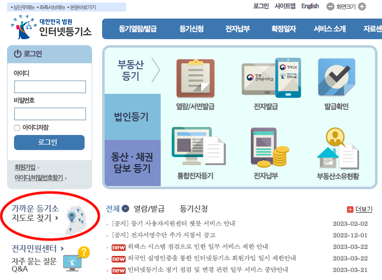 인터넷등기소 메인화면 좌측 하단을 보시면, 지도에서 가장 가까운 등기소 찾기클릭